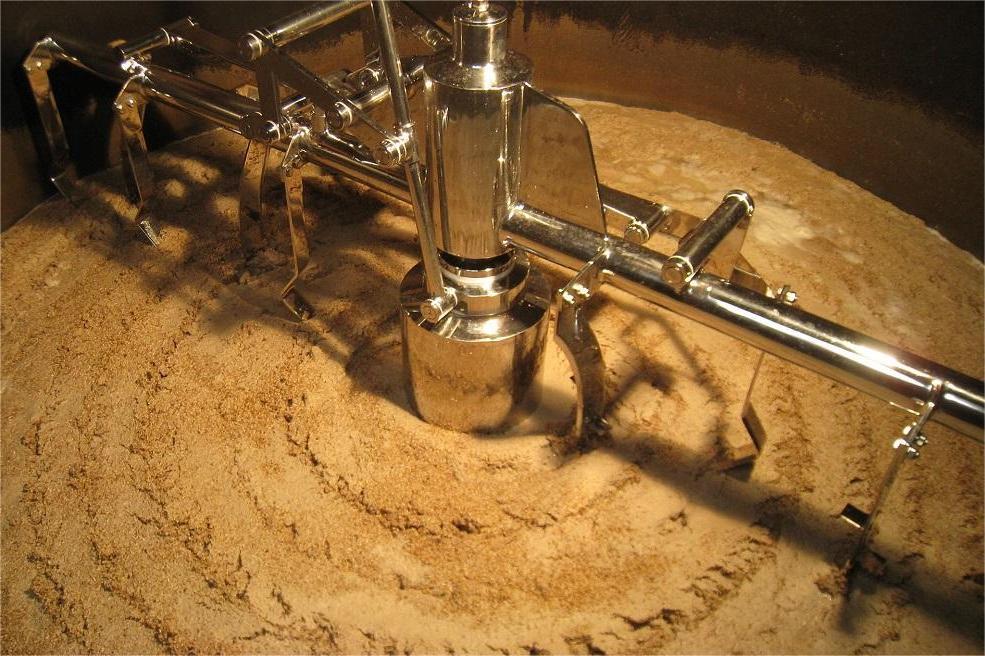 配备高级自动化控制的中大型啤酒厂会尽可能减少生产车间中的人力,通过液位传感器判断过滤完成后,底部出糟口阀门打开,耕刀打开,转动将麦糟推下出糟口。啤酒厂一般会配备一个麦糟箱,这时候麦糟先掉进麦糟箱中,暂存部分麦糟。麦糟箱主要的作用是在出糟速度跟麦糟运输速度之间起一个缓冲。需要注意的是:排糟要由上而下缓慢进行,以免出糟太快造成管道堵塞;耕糟不要耕太深,以免造成耕刀变形;耕糟机升降不要超出上、下限标志以免耕刀刮坏筛板。洗糟残液流完后,将耕刀横向调节进行排糟。在新式过滤槽中,则是向下打开排糟板,麦糟从底部排糟口落下。新型排糟口已由原来的圆形改进为扁圆型,因此,大大地提高了出糟的速度。