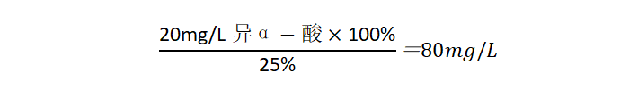 我国在啤酒生产上根据α-酸含量确定酒花添加量尚未普及,但国家对啤酒质量已确定了苦味物质含量,通常控制麦汁的苦味值不超过50BU(1BU=1mg/L异α-酸),啤酒的苦味物质含量则按不同要求控制在15~40BU之间。酒花添加量的计算方法举例如下。
