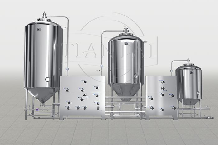 (6)酵母扩大培养罐 管道和培养罐经严格灭菌后,接入汉生罐培养液,并添加14~16℃的麦汁400~500L,次日待发酵旺盛期再追加12~15℃的麦2000~2300,24h后将培养液移至酵母繁殖槽。
