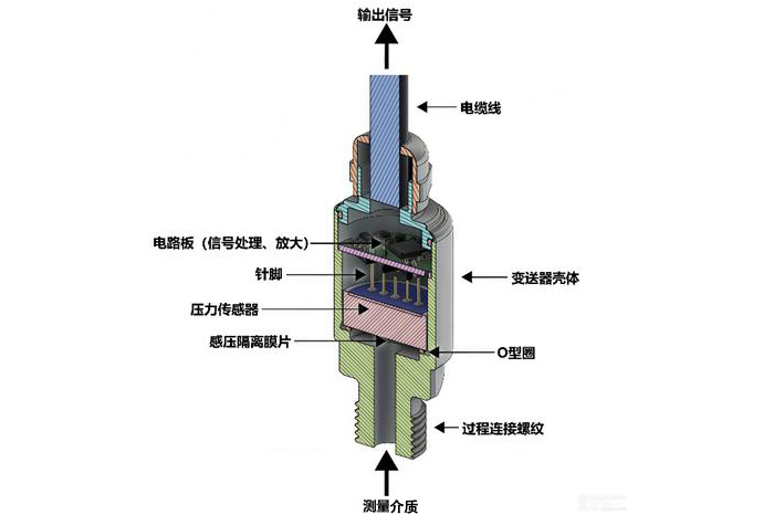 严格来说,传感器是变送器的组成部分。一台压力变送器通常以一个棒状结构作为主体,棒的下端是与被测介质连接的螺纹(或者法兰等),而棒的上端则用来安装电路板、接插件、显示屏等电子元件。