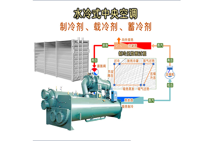在典型的水冷式中央空调中,制冷剂在冷水机组内部循环,通过蒸发器从外部循环水吸热蒸发,实现制冷。