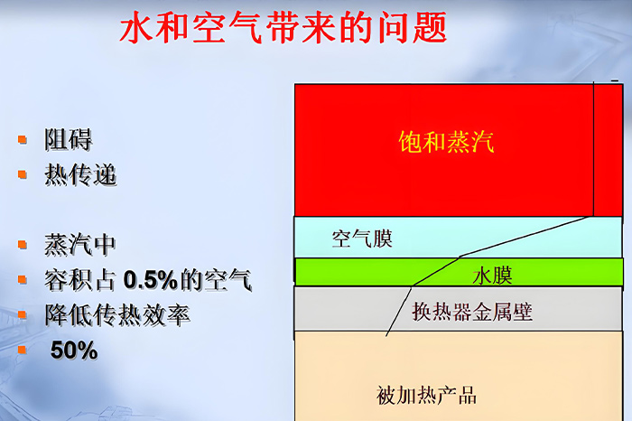 实际生产中我们有时会发现,蒸汽压力和流量都足够,而被加热产品的温度却始终达不到要求,这可能是因为系统中混入了空气所致。空气被蒸汽一起携带到换热表面,当蒸汽冷凝后,空气会残留积聚在换热表面形成绝热层,阻止蒸汽传热,导致产品温度不达标。