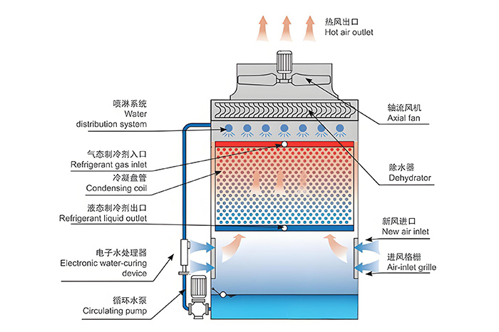 蒸发式冷凝器主要由冷却水循环系统、制冷剂循环系统和电气控制系统组成。其中,冷却水循环系统主要由喷淋水槽、水泵、风机等组成,制冷剂循环系统主要由蒸发器、冷凝器、压缩机等组成,电气控制系统主要由控制柜、温度传感器、水位开关等组成。