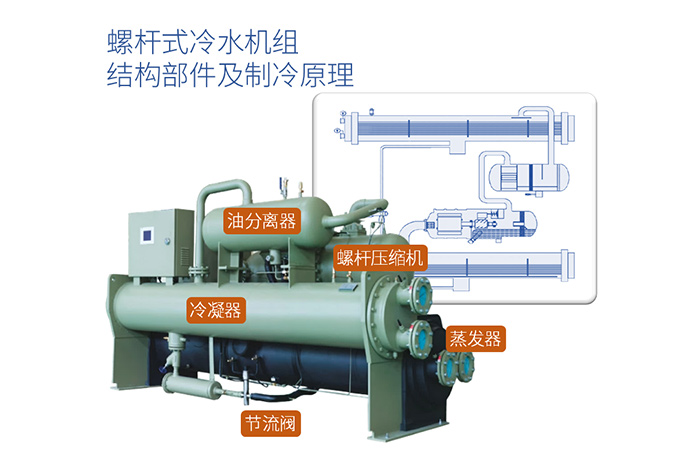 螺杆式冷水机组是中央空调常用的主机形式,主要部件为螺杆式压缩机、外置油分离器、冷凝器、膨胀阀、蒸发器。